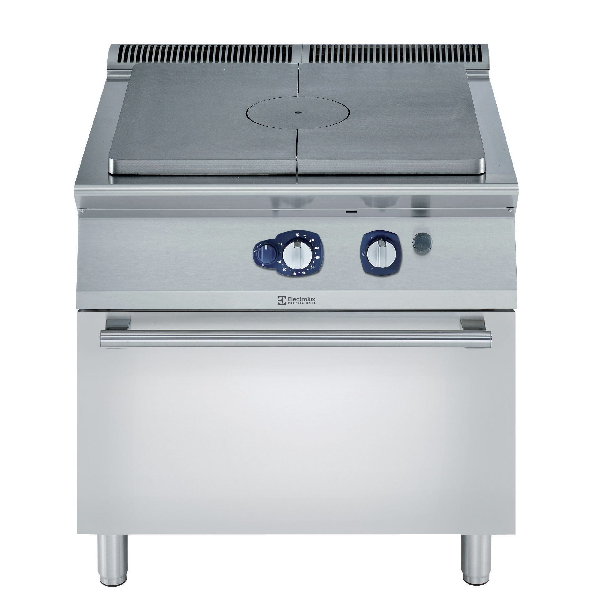 The Electrolux Modular Cooking Range Line Gas Solid Top Range Oven 13kw is high efficiency 7 kW central burner, flame failure device and protected pilot light. Suitable for natural gas or LPG. Large cooking surface with different heating zones. Large flat cooking surface made in cast iron allows for the use of a number of various sized pots and pans, all easily moved across the surface without lifting. Stainless steel oven chamber with 3 levels of runners to accomodate 2/1 GN shelves (2 steam pans). Exterior panels in stainless steel with Scotch Brite finish. One piece pressed work top in 1.5 mm thick stainless steel. Right-angled side edges to allow flush-fitting junction between units.