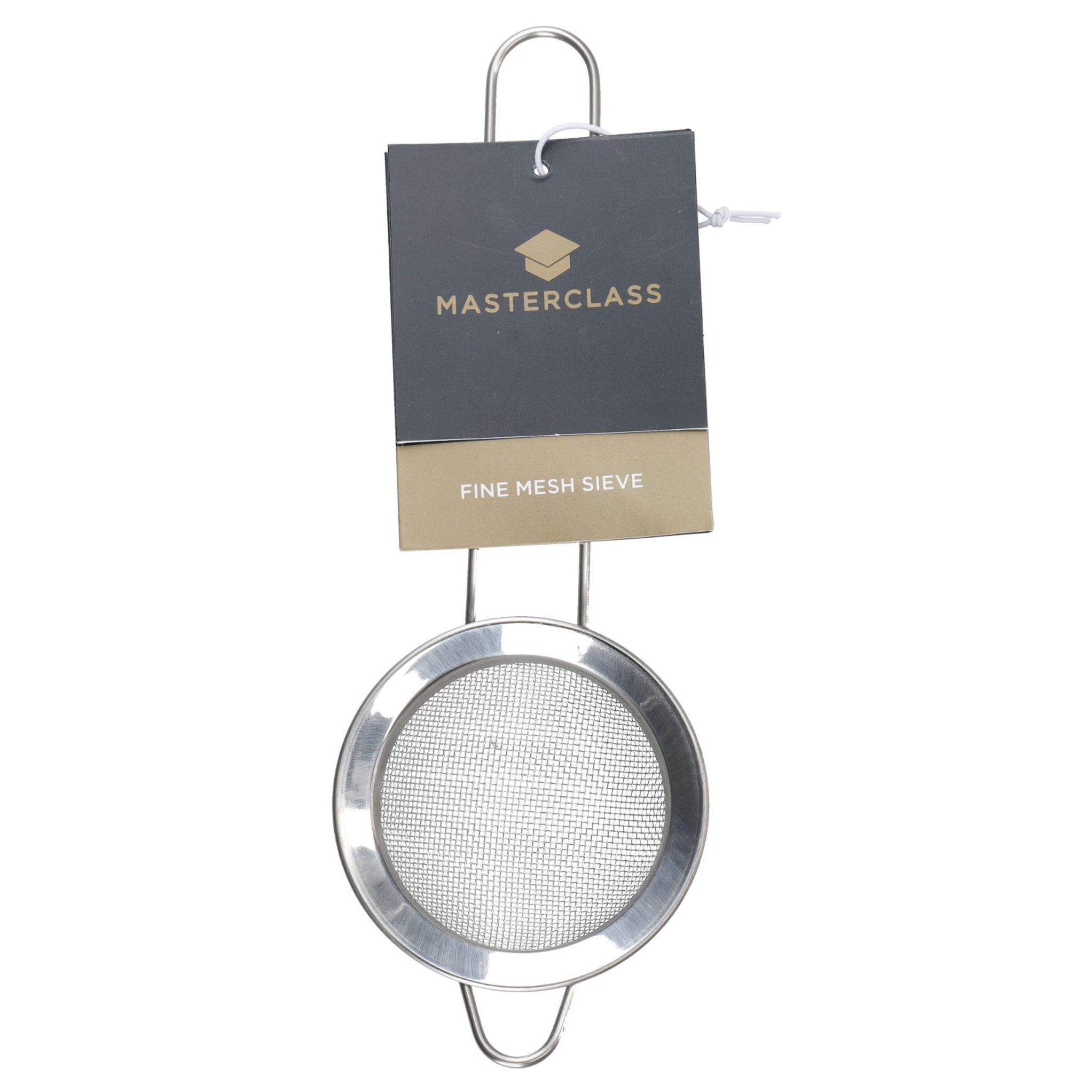 The MasterClass Stainless Steel Fine Mesh Sieve 7.5cm features a highly polished rim and twin wire hooked handle and bowl rest, perfect for icing biscuits and small cakes.
